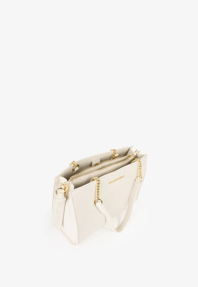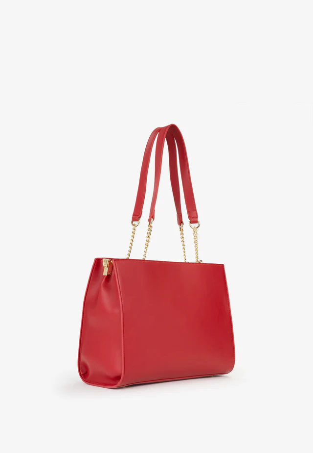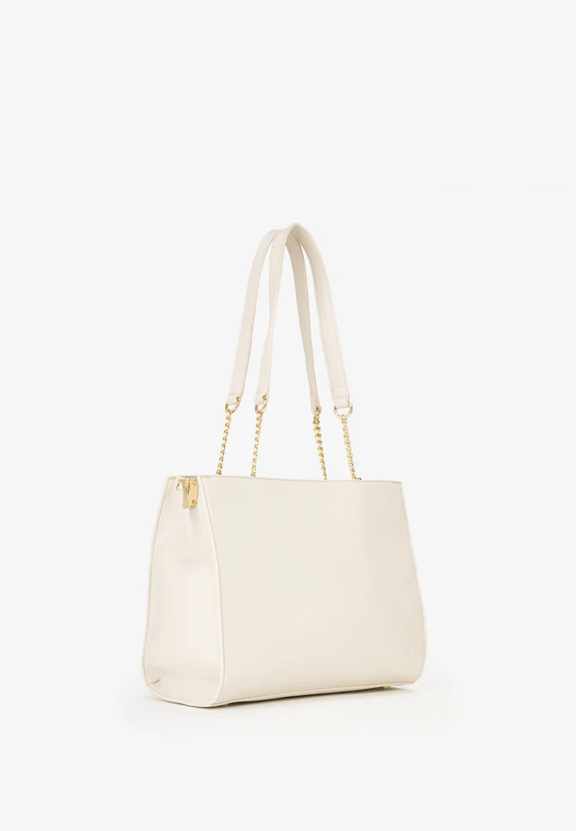 Shopping a spalla con manico dettaglio catena, logo frontale in metallo e accessorio removibile logato.