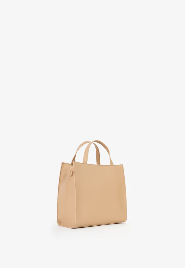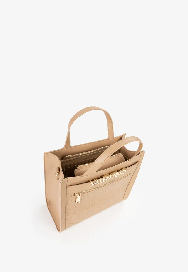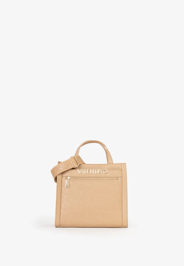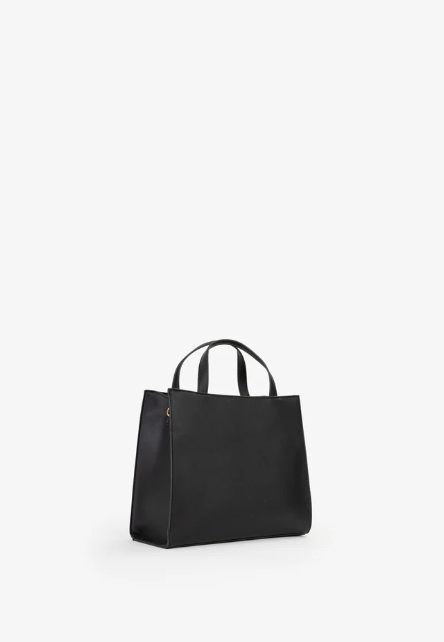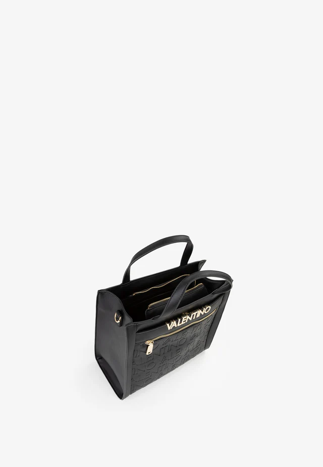 Shopping a mano con tasca frontale, embossata e logo in lettere di metallo grandi.